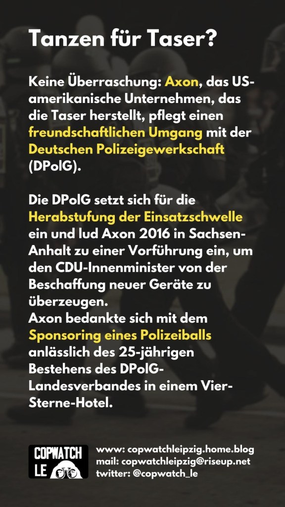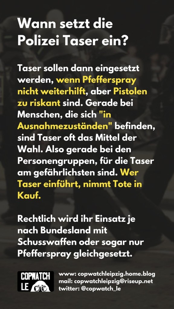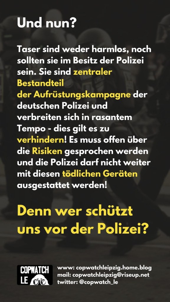 der Aufrüstungskampagne der deutschen Polizei und verbreiten sich in rasantem Tempo – dies gilt es zu verhindern! Es muss offen über die Risiken gesprochen werden und die Polizei darf nicht weiter mit diesen tödlichen Geräten ausgestattet werden!