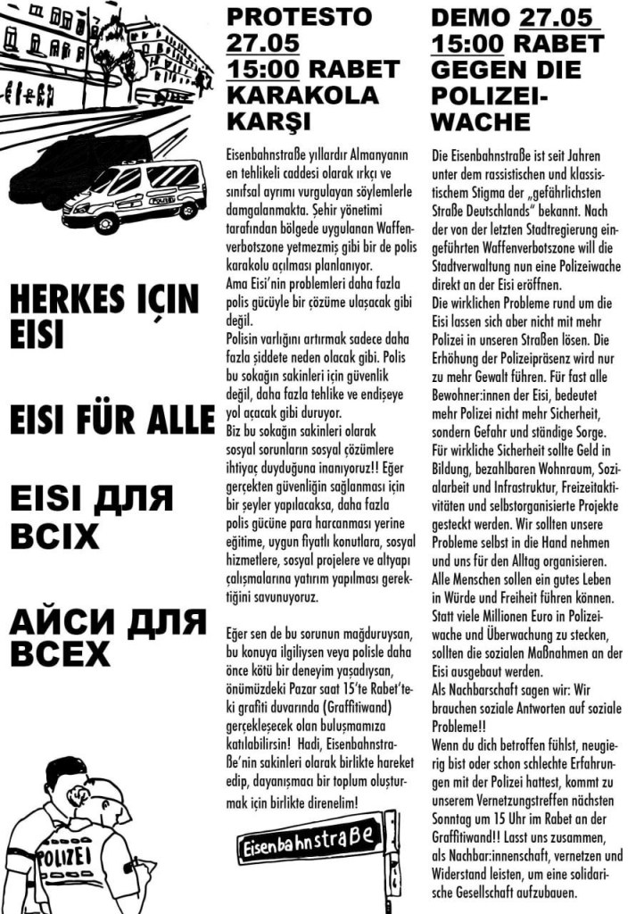 Auf der Eisenbahnstraße sind zum Internationalen Tag gegen Polizeigewalt #15mrz Plakate an dem Laden aufgetaucht, in den 2023 ein neuer Polizeiposten als “Ersatz” für die WVZ kommen soll. Sie kritisieren das und fordern: #EisifürALLE & #SolidaritätstattPolizei (de/tr/ar).