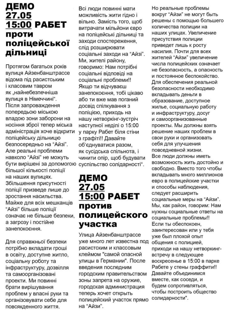 Всі люди повинні мати можливість жити гідно і вільно. Замість того, щоб витрачати мільйони євро на поліцейські дільниці та заходи спостереження, слід розширювати соціальні заходи на “Айзі”.